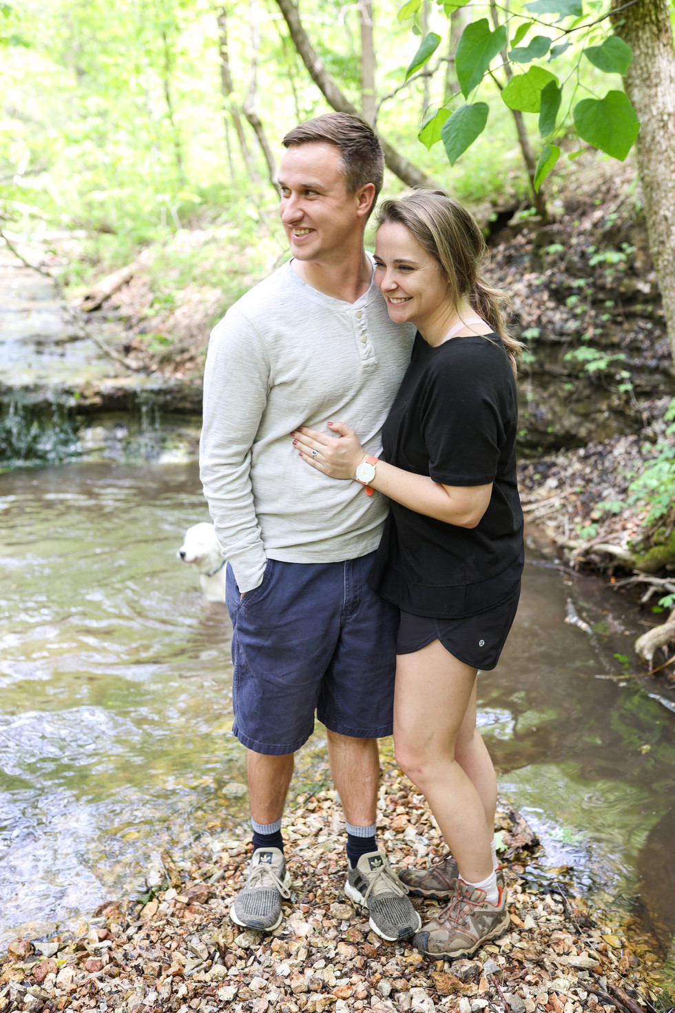 Rhett, Michelle, and Oakley love to take hikes together, so when Rhett casually suggested that they take a hike over the weekend, they were all in! Rhett had asked me to be present to take pictures of the proposal which was a HUGE HONOR. He planned everything out and left markers so I would know where to stop on the trail to wait for them. I climbed a hill by the waterfall where they would stop and hid behind a tree. I had purposefully picked out clothes that would camouflage me so that I wouldn't ruin the surprise or spook Oakley.